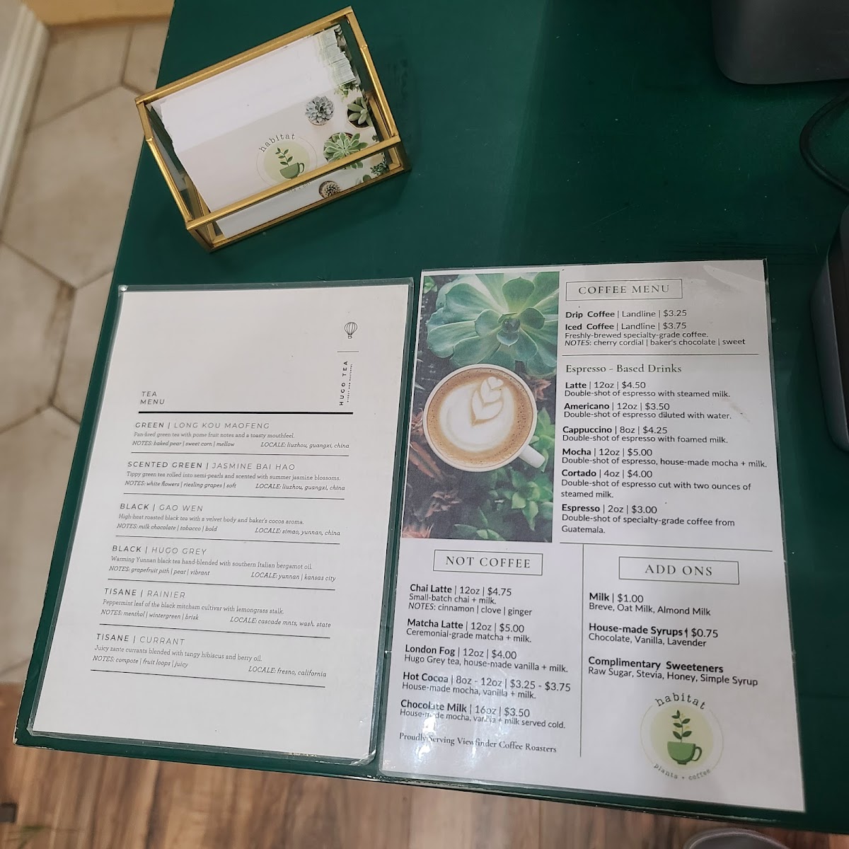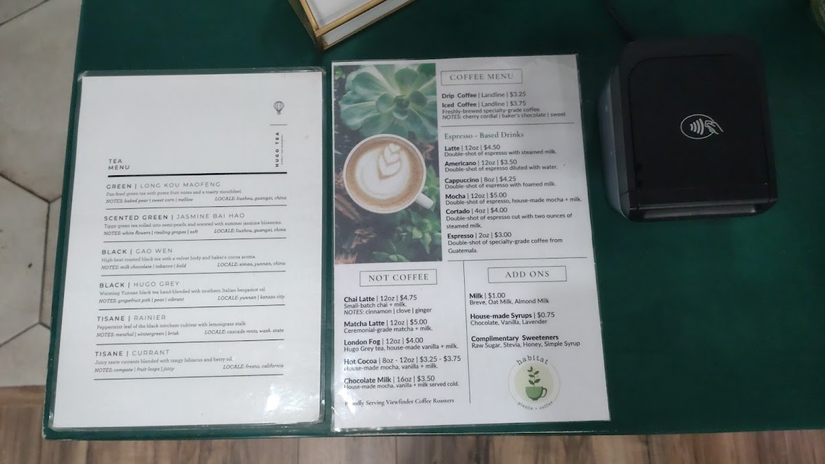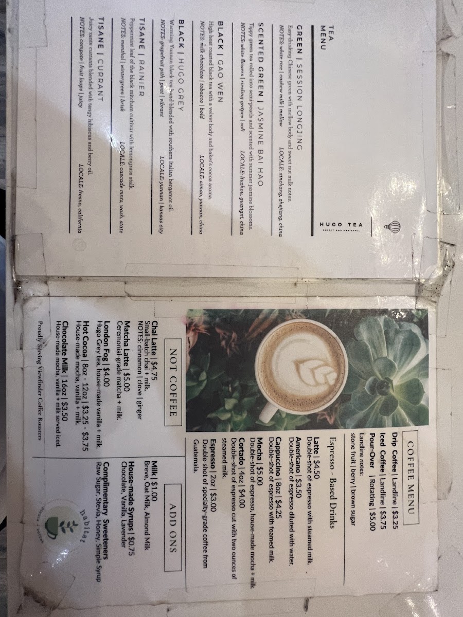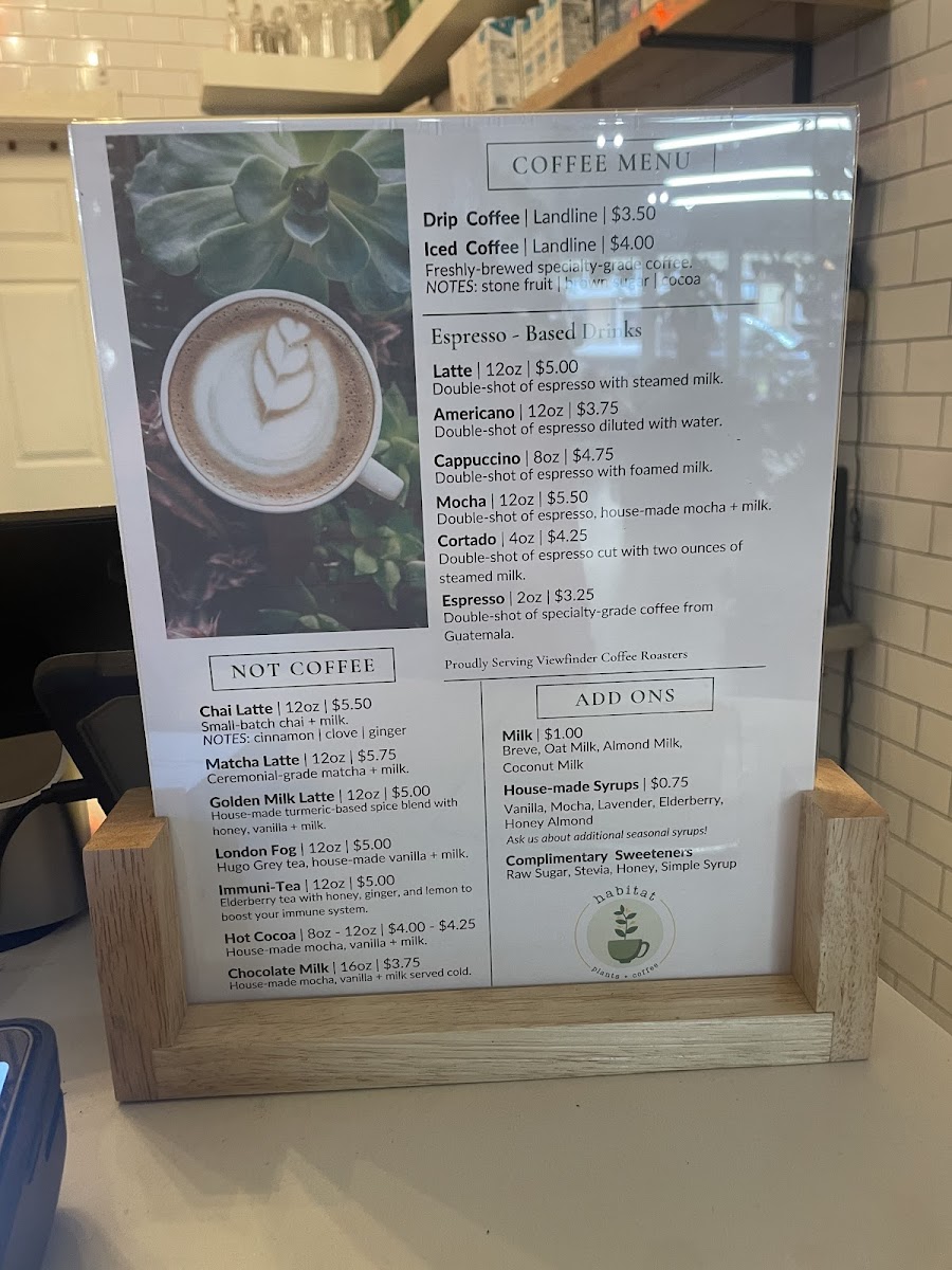 Overall, Habitat Plants + Coffee’s menu offers a well-curated selection of drinks and light bites that cater to a variety of tastes. Whether you're a coffee enthusiast or a tea lover, you'll find something to enjoy, while the plant-filled ambiance of the café adds to the charm of the experience.